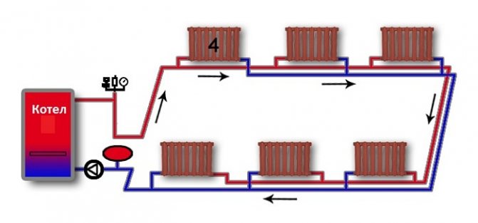 Par ce tuyau, le liquide de refroidissement chaud est fourni par la chaudière, tous les radiateurs passent dans l'ordre, dégageant de la chaleur, il se déploie sur ce dernier, et par le deuxième tuyau, collectant le retour de tous les radiateurs, il retourne à la chaudière.