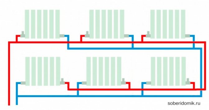 - Deux tuyaux. Chaque batterie de radiateur est connectée en parallèle aux tuyaux pour l'alimentation directe du fluide caloporteur chaud et le «retour». Autrement dit, chaque appareil est fourni avec une sortie individuelle au «retour». Avec l'évacuation simultanée de l'eau refroidie dans le circuit commun, le liquide de refroidissement retourne à la chaudière pour le chauffage. Mais dans le même temps, le chauffage des appareils de chauffage diminue également progressivement à mesure qu'ils s'éloignent des sources de chaleur. Le radiateur situé en premier dans le réseau reçoit l'eau la plus chaude et est le premier à donner le support au «retour», et celui situé à l'extrémité reçoit le liquide de refroidissement comme le dernier avec une température de chauffage abaissée et aussi le dernier à donner eau vers le circuit de retour. En pratique, dans le premier appareil, la circulation d'eau chaude est la meilleure, et dans le dernier c'est la pire. Il convient de noter l'augmentation du prix de ces systèmes par rapport aux systèmes monotube.