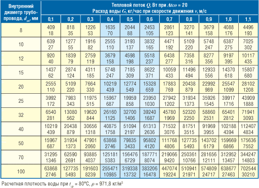 = 90-70 = 20 ° C (pour les systèmes de chauffage à deux tubes) ou le débit du caloporteur, il est pratique d'utiliser le tableau 1.