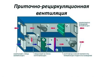 Dans les systèmes d'alimentation et de recirculation, une partie de l'air est prélevée dans la rue et l'autre partie est prélevée dans la pièce. Les deux pièces sont mélangées et, après chauffage à la température requise, sont livrées dans la pièce.