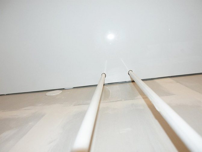 La dérivation est placée sur le tuyau. Ils commencent à remplir le film à côté des communications. Ensuite, ils prennent un petit morceau de plastique et le collent sur la coupure entre le mur et le tuyau (également de l'intérieur). Ainsi, la couture se révélera uniforme et pratiquement impossible à distinguer, et l'apparence du plafond sera esthétiquement agréable.