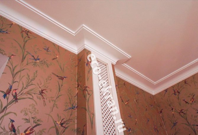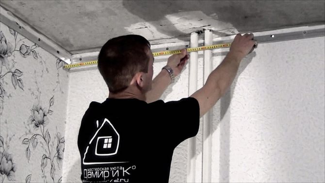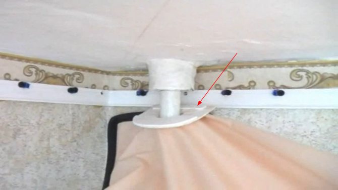 Tout d'abord, le tissu est fixé dans des baguettes. Tirez autour du tuyau pour qu'il n'y ait pas de plis. Une coupure est faite à partir de la communication avec le mur et plusieurs plus petites autour du tuyau. La toile est rentrée dans le profil afin que les bords soient connectés. Le reste du matériau dans la zone du tuyau est retiré à l'intérieur.