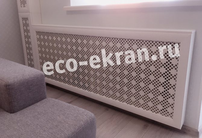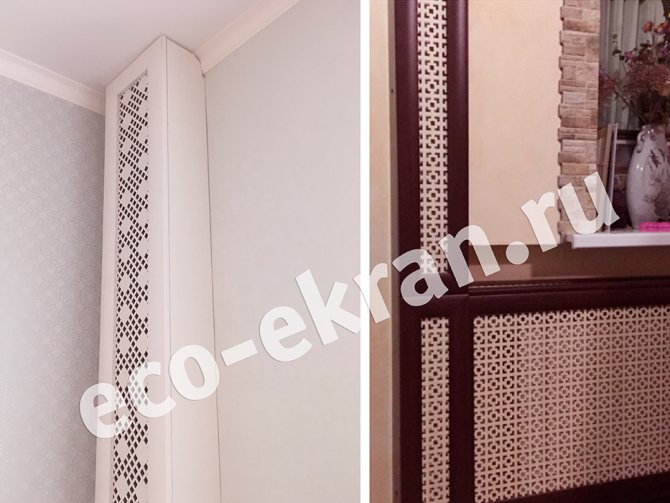 Important! L'avantage des écrans décoratifs est qu'ils cachent les tuyaux de chauffage et les radiateurs à l'intérieur, et les inconvénients sont associés à une détérioration de la circulation de l'air chaud dans la pièce.
