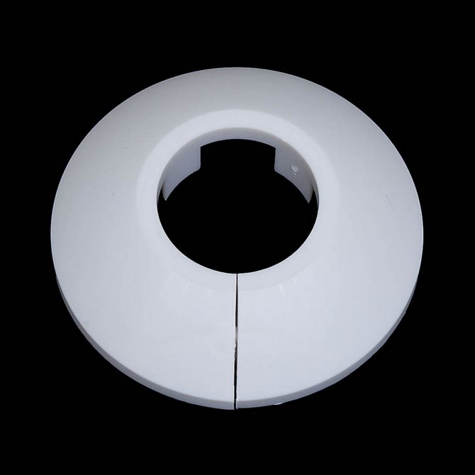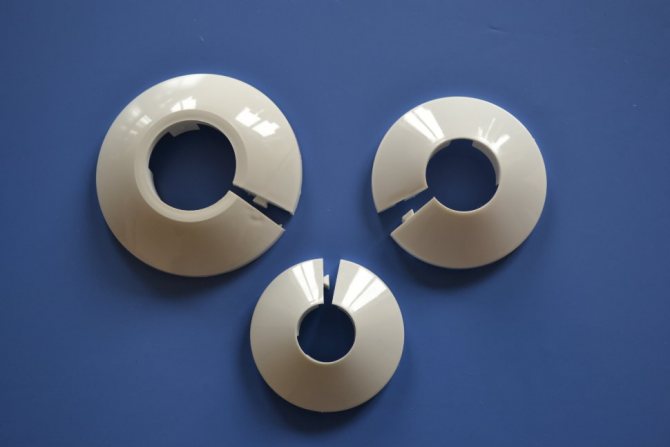 Il existe des éléments décoratifs spéciaux en vente qui sont conçus pour masquer la jonction d'une surface de mur ou de plafond avec des colonnes montantes chauffantes. La dérivation des tuyaux de chauffage est de différents diamètres. Il est choisi en fonction de la section du tuyau. Le couvercle se compose de deux moitiés fendues avec un trou de tuyau dans la partie centrale.