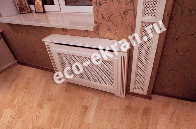 Principalement en vente, vous pouvez trouver des écrans décoratifs pour appareils de chauffage. Il s'agit d'un écran avec des fentes pour la circulation de l'air, qui est accroché au radiateur ou installé sur une niche à l'intérieur de laquelle se trouve l'appareil. L'écran peut être articulé, attaché et s'ouvrant. Pour sa fabrication, on utilise du plastique, du métal ou du bois. Ce dernier matériau est moins souvent utilisé en raison de son coût élevé et de sa faible résistance aux effets de la température.