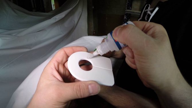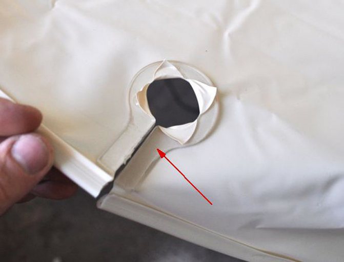 Le bypass est enduit de colle le plus près possible des bords intérieurs et appliqué sur la toile. Ensuite, des découpes sont faites: du harpon au centre et au milieu - en travers (plusieurs fois). Les pétales qui en résultent sont pliés pour plus de fiabilité et également collés à la plaque. Le harpon et le film dans la zone de coupe sont renforcés avec un petit morceau de PVC.