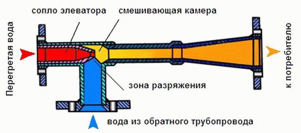 À l'aide d'un ascenseur, la température de l'eau surchauffée est abaissée à la température calculée, après quoi le liquide de refroidissement préparé est envoyé aux appareils de chauffage. Le principe de fonctionnement de l'unité d'ascenseur est basé sur le mélange du liquide de refroidissement surchauffé de la conduite d'alimentation avec de l'eau refroidie de la conduite de retour.