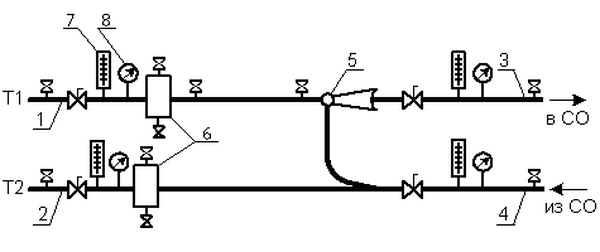 Si l'eau dans la canalisation d'alimentation n'est pas chauffée à plus de 95 0 С, elle est simplement distribuée à travers le système de chauffage à l'aide d'un collecteur équipé de dispositifs de réglage (vannes d'équilibrage). Si la température du liquide de refroidissement est supérieure à 95 0 С, selon les normes en vigueur, cette eau ne peut pas être fournie au système de chauffage. Nous devons le refroidir. C'est là que l'unité d'ascenseur entre en service. Il convient de noter que l'unité de chauffage d'ascenseur est le moyen le moins cher et le plus simple de refroidir le liquide de refroidissement.