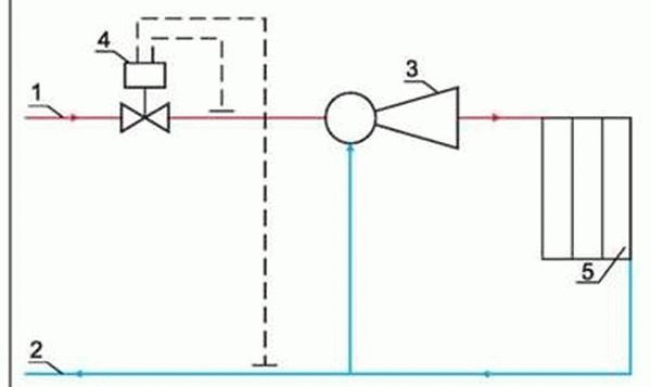 Selon le schéma, l'eau chaude fournie par les services publics entre dans la maison par un tuyau «chaud». Après avoir «contourné» tout le bâtiment, il retourne à l'unité dans un état refroidi et est retiré du système. Mais dans l'ascenseur, l'eau chaude et "froide" est mélangée, ne permettant pas à la température d'aller au-delà des limites autorisées. Dans certaines situations (adaptées aux zones à basses températures), un mécanisme de chauffage est intégré à l'ascenseur: si la température de l'eau pendant le mélange est inférieure au niveau admissible, le mécanisme se met en marche.