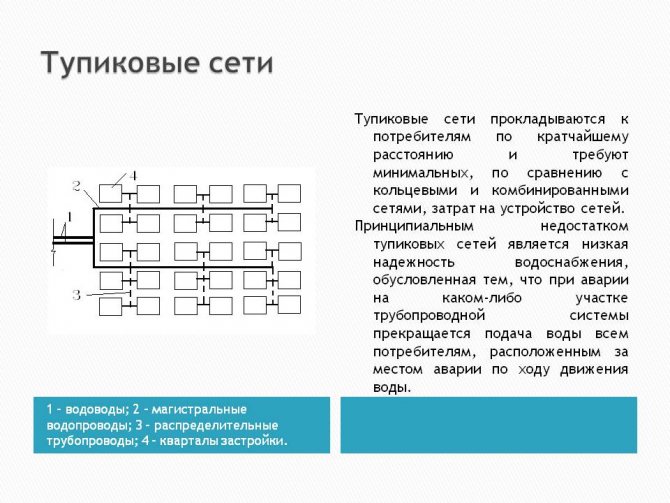 Un réseau sans issue est une option très pratique pour les bâtiments avec un petit nombre d'étages et des contremarches courtes. Ils sont souvent conçus pour les conduites d'eau d'utilité (hors production) des entreprises industrielles et pour tous les bâtiments à consommation d'eau chaude stable ou à long terme (bâtiments résidentiels, établissements de restauration, bains et établissements de santé).
