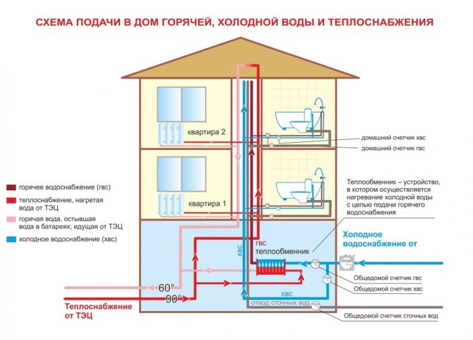 En général, le système ressemble à ceci: deux tubes - l'alimentation et le retour sont connectés dans une unité d'ascenseur ou un point de chauffage, où l'eau est amenée aux 60 degrés Celsius requis. Ensuite, l'eau chaude est fournie à la canalisation interne du bâtiment, aux points pliables.