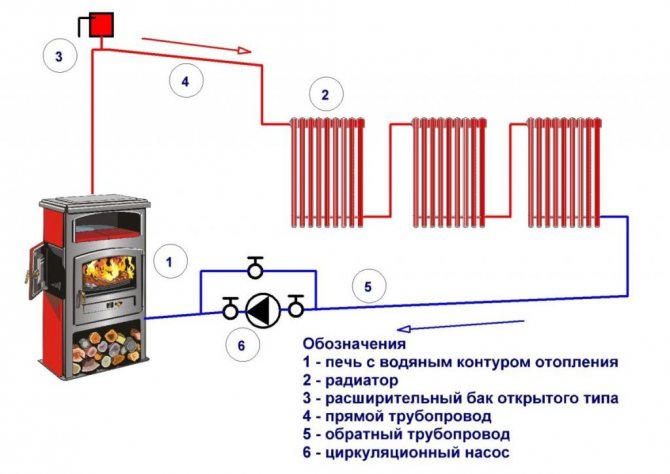 Les radiateurs sont connectés selon un schéma monotube.Dans cette version, le processus de chauffage se déroule comme suit: