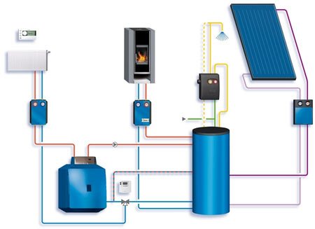 Les derniers représentants développés ont des éléments chauffants intégrés pour fonctionner sur des vecteurs d'énergie existants, et il existe également des brûleurs qui vous permettent d'utiliser à la fois du gaz et du diesel, simplement en basculant le commutateur sur le mode souhaité. Afin d'économiser de l'argent et d'obtenir l'effet souhaité de chauffer une grande surface, il convient d'utiliser un accumulateur de chaleur, surtout dans les chaudières à charbon. Lors de l'utilisation de combustibles solides, la puissance du système de chaudière n'est pas régulée et la pièce devient extrêmement chaude. Le présent accumulateur de chaleur: