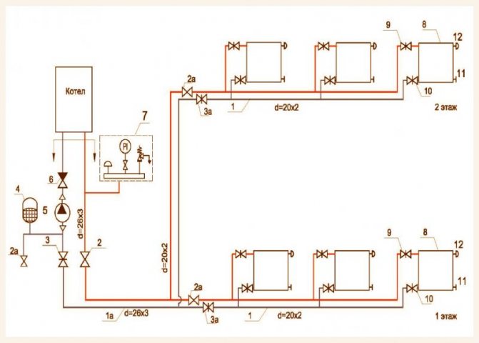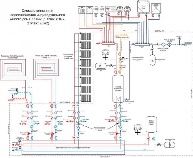 Chaudière - un appareil qui chauffe l'eau pour un usage domestique ultérieur. C'est un grand récipient qui recueille et chauffe automatiquement l'eau en elle-même, pour un retour ultérieur via le système de bec local. Par rapport à une chaudière, elle consomme moins de carburant en raison du concept et de la conception mêmes de la chaudière. Le caloporteur est un liquide pour transférer la chaleur à l'intérieur du système de chauffage, le plus souvent de l'eau ordinaire est utilisée. Le système de chauffage peut être fermé ou à circulation. Dans un système fermé, le liquide de refroidissement circule à l'intérieur du système au moyen d'une pompe électrique. Les circuits de chauffage sont des dispositifs de transfert de chaleur (radiateurs, circuit de chauffage par le sol, etc.). Il peut être divisé en système d'alimentation en liquide de refroidissement à deux et à un tuyau. Le plus confortable est le système à deux tuyaux - un système plus flexible en termes d'automatisation et de régulation grâce à la séparation des circuits de chauffage.
