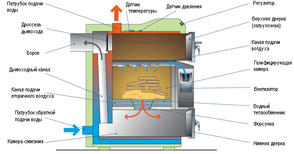 Lors de la combustion du combustible chargé, la chaudière chauffe l'eau ou un autre caloporteur utilisé dans un système de chauffage autonome particulier. Les tuyaux, par contre, dégagent de la chaleur vers les batteries et l'espace environnant.