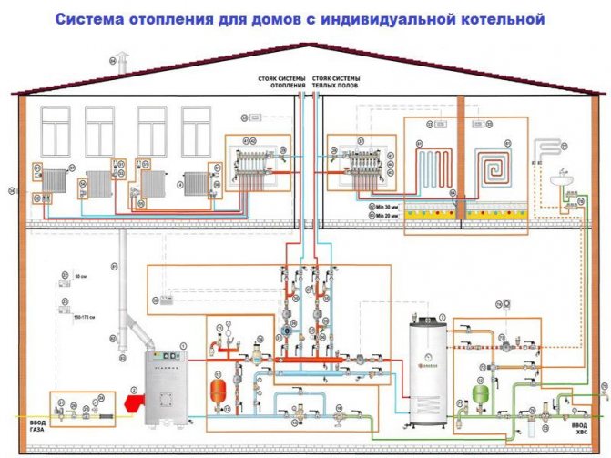 Comme mentionné ci-dessus, dans le cas d'une maison privée, tout est beaucoup plus simple. Ici, vous pouvez installer à la fois une chaudière à gaz et une chaudière électrique, ainsi qu'un combustible liquide et un combustible solide. Dans une maison privée, personne n'interdit de faire un plancher d'eau ou d'installer des panneaux solaires sur le toit, un capteur de chauffage solaire ou d'installer une pompe à chaleur dans la maison. Ou vous pouvez même construire une mini-chaufferie à côté d'un immeuble résidentiel.