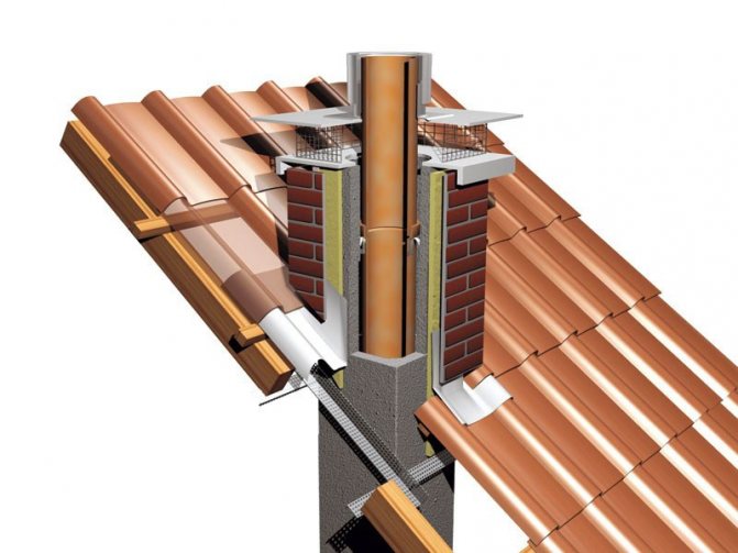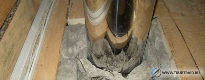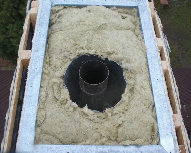 Ensuite, vous devez placer des tuyaux isolés sur la buse du four ou de la chaudière à travers le trou dans le plafond ou le toit. Une fois l'installation terminée, vous devez remplir la tôle autour de la colonne montante avec un matériau spécial non combustible. Pour résoudre ce problème, vous pouvez utiliser de l'amiante, de l'argile ou de l'argile expansée.