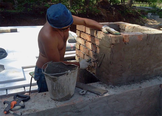 Il est important que les éléments soient étroitement adjacents les uns aux autres. Après avoir fini de fixer tous les éléments, la cheminée est légèrement inclinée. Les inconvénients des joints sont éliminés avec le mortier de ciment.