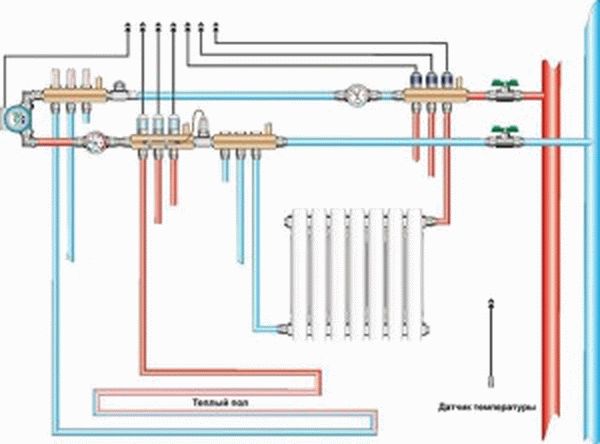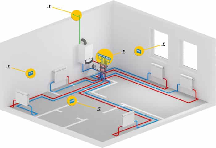 Dans un tel système, la connexion va directement au collecteur, assurant ainsi une répartition uniforme de l'énergie thermique sur toute la zone chauffée. Avec ce schéma, les circuits d'alimentation et de retour fonctionnent indépendamment l'un de l'autre. Le fluide chauffant traverse les radiateurs et est renvoyé pour le cycle de chauffage suivant. Le résultat est un système fermé dont le fonctionnement est automatiquement régulé.