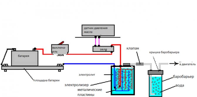 L'eau dans des conditions idéalement scellées est introduite dans le récipient avec la dialectique. Il existe des plaques en acier inoxydable dont la butée est assurée par un isolant. Les plaques reçoivent une tension de 12 volts. Le résultat sera la décomposition de l'eau en gaz.