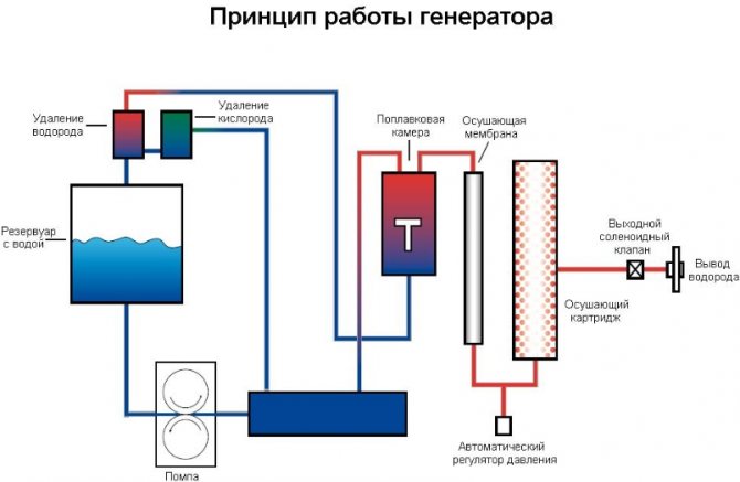L'hydrogène commence à être produit après l'entrée de la solution électrolytique dans la cellule. Sous l'influence d'un catalyseur avec O2, l'élément est divisé en chaleur et eau. La chaleur résultante, qui a une température d'environ 40 degrés, va au système de chauffage, en passant par un échangeur de chaleur. Très souvent, cette température est suffisante pour chauffer complètement la maison avec des sols chauds.