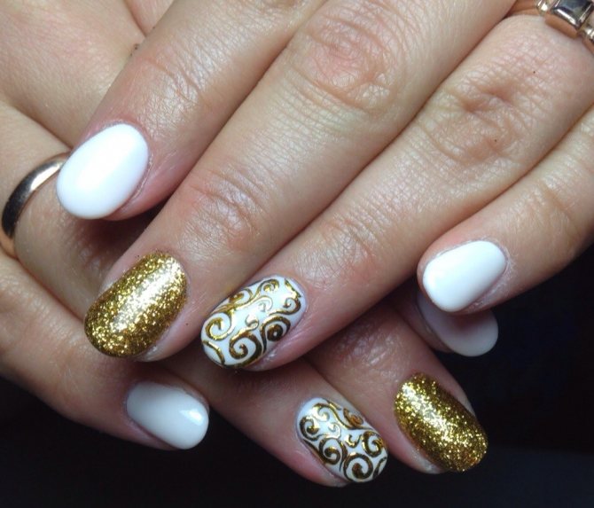 - La feuille d'or semble intéressante dans les looks festifs et la manucure du soir. Semble spectaculaire sur un fond noir, combiné avec du vert, du bleu, du rouge et du blanc. Vous pouvez coller le décor avec des rayures ou des motifs.