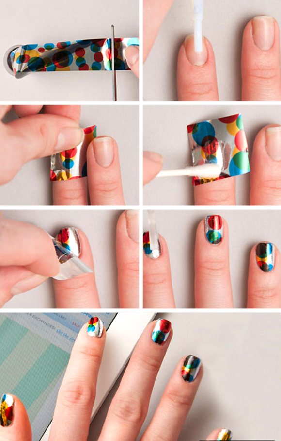 - Appliquez la feuille ou le ruban adhésif sur l'ongle avec le côté vers le bas et «traduisez»-le de manière pratique: lissez-le avec votre ongle, un coton-tige ou un coton-tige orange. Dans le même temps, essayez de ne pas déplacer le film, sinon un revêtement uniforme ne fonctionnera pas.