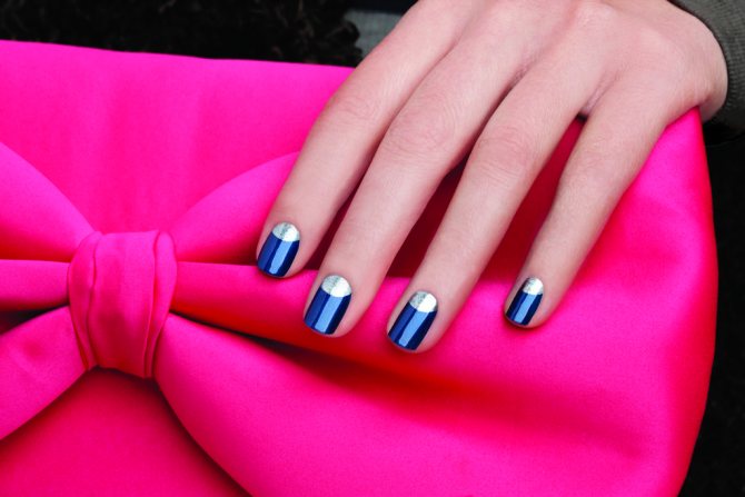 Une option sûre consiste à décorer vos ongles avec des rayures brillantes. Ils peuvent être mis en caisse dans différentes directions, utiliser des fragments étroits et larges et créer des motifs géométriques.