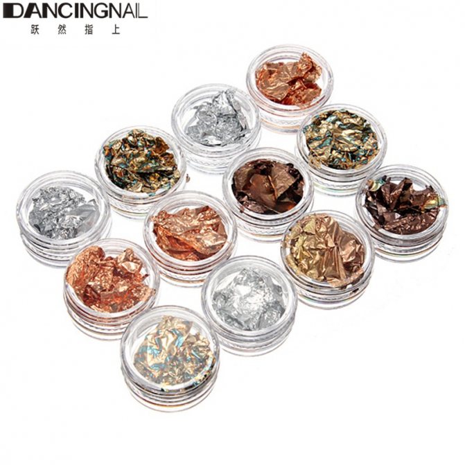 Le film d'aluminium pour la décoration peut être monochromatique, coloré. La gamme de couleurs reprend presque toutes les nuances de revêtements à la mode. Vous pouvez choisir un bijou brillant dans la couleur de votre vernis, un ton plus foncé ou plus clair, contrastant, or, argent.