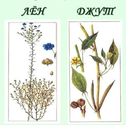 La plante a une structure similaire à celle du lin. Le lin est utilisé pour la production de textiles, tandis que le jute est utilisé pour la fabrication d'équipements techniques - sacs, cordes et isolants. Cette application est due à la plus grande rigidité des fibres de jute devant le lin.