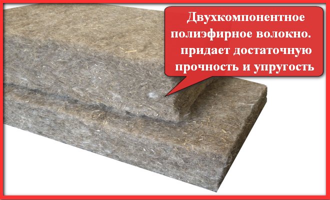 Forme de libération du matériau - tapis de 5 ou 10 centimètres d'épaisseur. Le coefficient de transfert de chaleur est ekolna 0,034 W / m ∙ K. L'isolation est suffisamment respirante, par conséquent, avec une densité de remplissage de 25 à 30 kg / m3, elle fournit une respiration suffisante aux murs, sans laisser passer l'humidité. La durée de vie doit être de 75 ans.