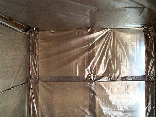 - Fixez des feuilles de papier d'aluminium avec un revêtement réfléchissant vers l'intérieur avec un chevauchement de 20 cm à l'aide de petits clous galvanisés.