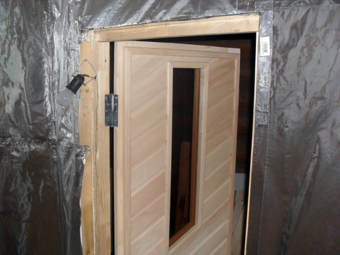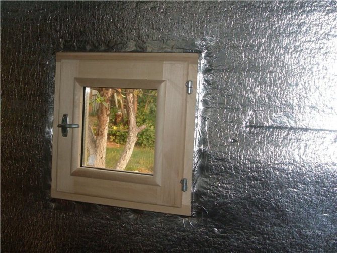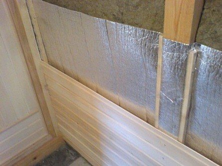 Pour qu'il n'y ait pas de fuite de chaleur et de vapeur, la feuille est posée sur les murs et le plafond de 5 à 10 cm. Au-dessus de la couche de feuille, plusieurs barres sont clouées pour créer un espace d'air pouvant atteindre 2 cm pour l'air convection. Et déjà la dernière couche de finition ou lambris en tilleul.