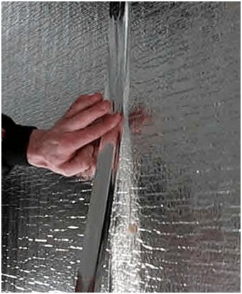 La prochaine étape consiste à installer la feuille. Cela bloquera la salle d'isolement. Il est important d'assurer une solidité à cent pour cent. La fixation est réalisée avec du ruban adhésif, qui peut être acheté dans une quincaillerie. Très souvent, il est vendu avec du papier d'aluminium.