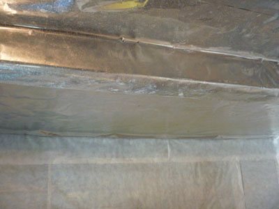 - Nous collons soigneusement les joints avec du ruban métallisé, en accordant une attention particulière aux coins de la pièce pour créer un revêtement complètement scellé.