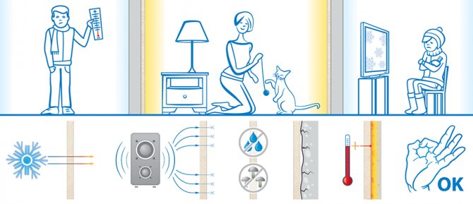 Par exemple, le béton gèle rapidement à des températures inférieures à zéro, et le polyéthylène expansé qui y est collé de l'intérieur retiendra la chaleur et augmentera le confort d'être dans la pièce.