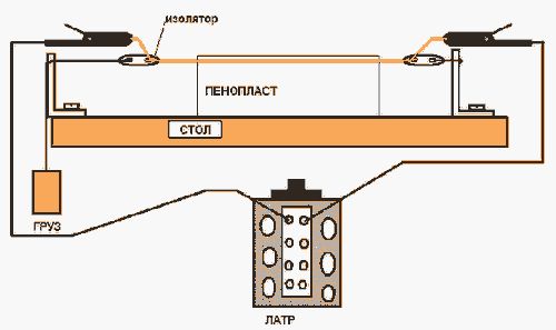 La table est placée à un angle (20-60 °), et un fil est tiré à travers, dont une extrémité est fixée de manière rigide, et un ressort est utilisé pour fixer l'autre. Les fils du transformateur connectés au réseau électrique y sont connectés. Le courant est fourni, la pièce est posée sur la table. Les feuilles sont coupées en glissant sous leur propre poids.