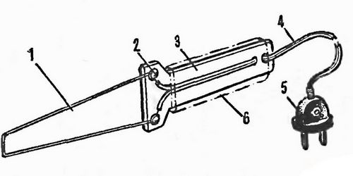 Schéma d'un coupe-mousse: 1 - fil nichrome (spirale d'une cuisinière électrique), 2 - vis avec écrou et rondelle, 3 - poignée (textolite S 4 mm), 4 - cordon d'alimentation, 5 - prise, 6 - caoutchouc ou vinyle tube de chlorure.