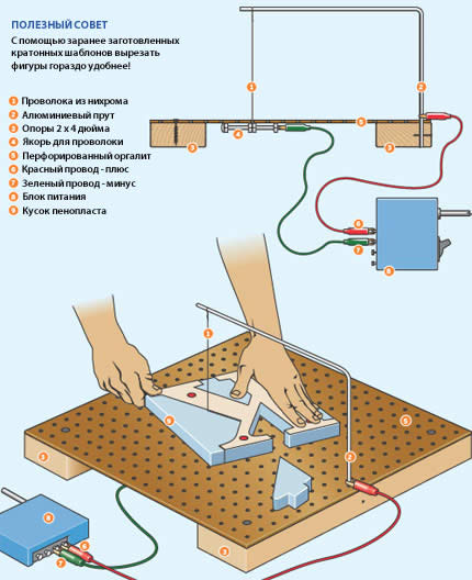 Avec un tel outil, vous pouvez couper non seulement des feuilles de mousse, mais également des lattes de bois, des tuyaux en plastique, tout matériau ayant une température de fusion ou de décomposition allant jusqu'à 270 ° C.