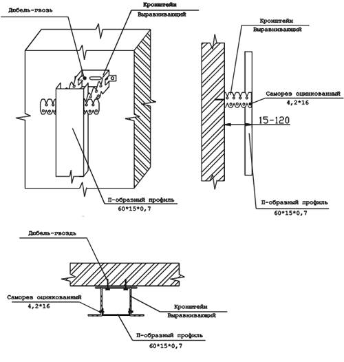Le revêtement est monté sur une surface solide et plane. Si cette condition n'est pas remplie, vous devez utiliser le système de nivellement. Il peut être en bois (bois d'une épaisseur d'au moins 25 mm), mais, compte tenu des lacunes du bois, une structure composée de supports de nivellement galvanisés et de profilés en U est plus efficace (Figure 4).