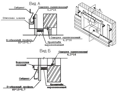 L'encadrement des ouvertures de fenêtres et de portes peut être: une bande de pente (Fig.9, vue A), une platine ou une bande de finition (Fig.8), dans certains cas, des coins extérieurs (85 * 85; 50 * 50; 30 * 30) sont utilisés, qui sont déjà installés sur le parement monté. Le rebord de la fenêtre est généralement placé sur le rebord de la fenêtre (Fig. 9, vue B).