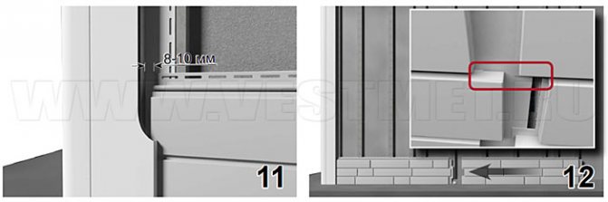 | Figure. 10. Pose du revêtement sur la fenêtre. | Essayez d'abord le panneau de sorte que les bords dépassent des deux côtés de l'ouverture de la fenêtre. Marquez ensuite la largeur de la fenêtre dessus, en ajoutant 6 à 10 mm. Les marques obtenues montreront les coupes verticales. (fig.10a) Faites un échantillon de coupe horizontale. Pour ce faire, renforcez un petit morceau de parement près de la fenêtre et faites-y des marques 6 mm sous le rebord (Figure 10b) des deux côtés de l'ouverture de la fenêtre, car il n'y a aucune certitude que le niveau de la fenêtre soit parfait. Transférez les marques des échantillons sur le panneau. Ensuite, effectuez la coupe souhaitée. Le montage du revêtement sur le dormant de la porte s'effectue de la même manière. 4. Installation de panneaux Dans le cas d'une conception horizontale, les panneaux sont montés de bas en haut. Accrocher le premier panneau avec la base à la bande de départ (Fig.11, vue B), puis fixer le bord supérieur du panneau avec des vis autotaraudeuses (dans le cas d'un lattage en bois, des clous), en partant de son centre. Avant de le fixer, assurez-vous que le panneau est fermement saisi sur toute sa longueur. Installez une vis autotaraudeuse (clou) au centre du trou, mais ne serrez pas fermement, en laissant un espace d'environ 0,8 mm pour un éventuel mouvement thermique du matériau. Tous les panneaux suivants sont accrochés sur déjà montés (Fig. 11, vue B) et fixés de la même manière. Assurez-vous de vérifier l'horizontalité des panneaux à monter.Afin d'éviter les déformations lors de la dilatation thermique, un espace de 6-9 mm doit être laissé. entre l'extrémité du panneau de parement et les composants verticaux (Fig. 11, vue A). Si vous décidez néanmoins de placer le parement verticalement, alors tout en fixant le panneau, installez le boulon le plus haut (clou) de sorte que le panneau y pende librement, puis installez tous les autres au centre des trous. Comme pour l'installation horizontale, il est nécessaire de vérifier la verticalité des panneaux et de laisser des espaces. |