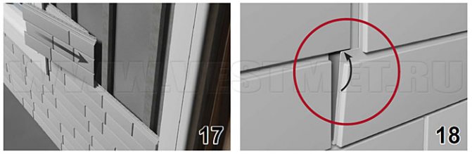 Après avoir fixé le premier panneau, le second y est attaché sur la serrure. Ainsi, toute la façade est revêtue. Les coins extérieurs entre les panneaux sont fermés avec des éléments supplémentaires.