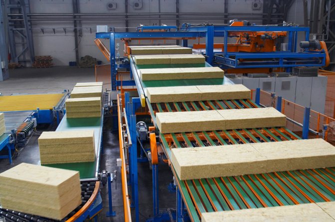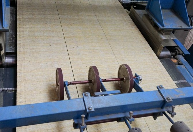 Noter! Ensuite, la laine de verre est refroidie, après quoi le processus de coupe commence. La bande continue provenant du convoyeur est découpée en morceaux au moyen de couteaux.
