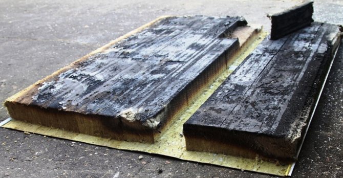 Le résultat d'une exposition de 15 minutes à une flamme nue sur un isolant en basalte d'une densité de 50kg / m3 (à gauche) et 45kg / m3 (à droite)