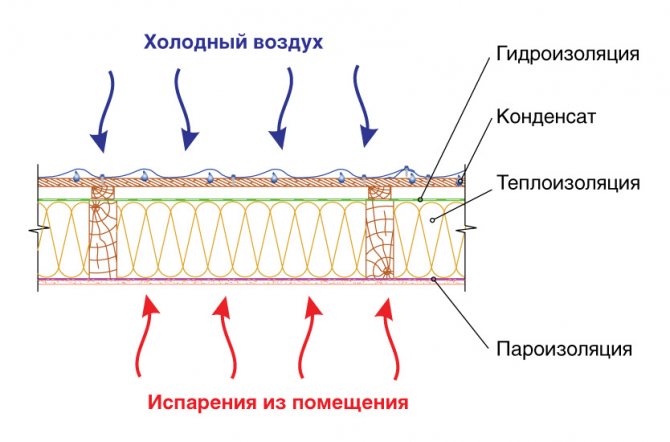 La vapeur pénètre facilement dans le mur ou le toit et «glisse à travers» l'isolant, qui a généralement une excellente perméabilité à la vapeur. Mais alors il "repose" sur le matériau extérieur avec une faible pénétration, et par conséquent, un point de rosée se forme à l'intérieur de la paroi, juste en face de l'obstacle sur le trajet de la vapeur.