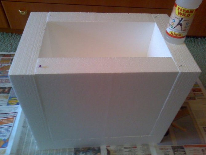 - Attachez le polystyrène (polystyrène expansé) les uns aux autres et, si la situation l'exige, appuyez avec des matériaux de lestage. Laissez tout pendant un certain temps avec la colle et les dimensions du matériau (de 20 minutes à plusieurs heures).