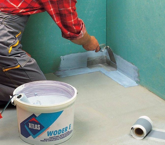 Un marquage soigneux de l'emplacement des zones humides et humides est effectué. Les zones humides sont traitées avec une composition polymère-ciment, les zones humides avec du mastic acrylique polymère. Effectuez le traitement en deux couches. Appliquez chaque couche suivante après que la précédente soit complètement sèche. Dans les coins et les endroits de butée des murs et des sols, il est nécessaire de coller des rubans polymères spéciaux, qui sont recouverts de mastic. Dans les endroits où passent des tuyaux, des membranes polymères élastiques spéciales sont utilisées, qui sont également recouvertes d'une couche d'usinage.