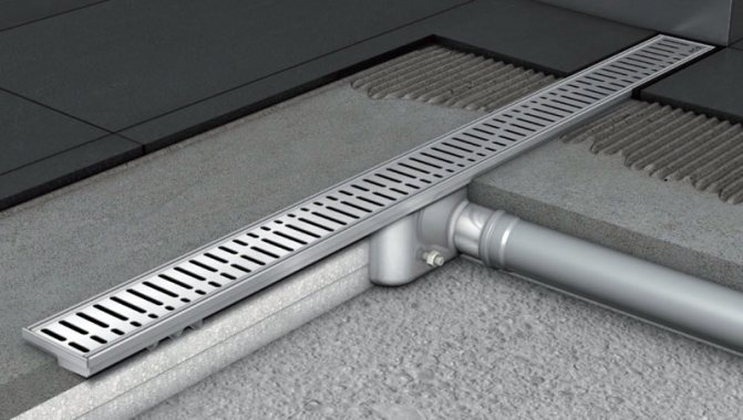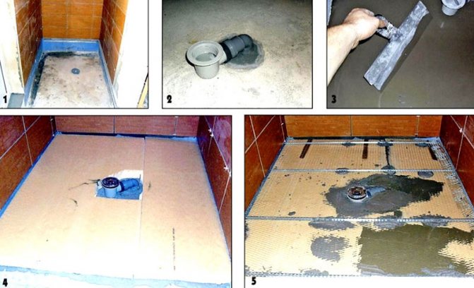 Une fois le mastic complètement sec, une échelle de drainage ou un canal de douche est équipé. Dans un endroit pré-marqué, une échelle est installée sur des coussins constitués d'un mélange ciment-sable, qui est raccordé à l'égout dans le respect de la pente (3 cm sur 1 m). Une chape est réalisée avec une épaisseur d'au moins 4 cm, si nécessaire, un sol chaud est placé dans la chape. À l'emplacement du drain de douche, la pente requise de la chape est faite pour drainer l'eau.
