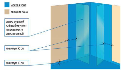 Quant au reste des sites, ils sont situés dans la zone humide. Ainsi, la cabine de douche doit être imperméabilisée sur toute la surface des murs, en capturant une zone d'environ 20 cm plus haute que la douche. Mais pour être sûr de la qualité de l'imperméabilisation, il vaut mieux ne pas économiser d'argent et faire ce travail sur toute la hauteur du mur, jusqu'au plafond même.